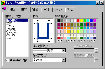 ![]() 次にピクチャーの外側のラベルの装飾です 罫線の属性を利用しています。 ![]() ・罫線タブでの設定 罫線モード(M):囲み罫線 罫線:左・下・右 線の太さ:5 point ・背景タブでの設定 影の太さ(S):5pt 影の色(X):薄いグレー ピクチャーの外側に、隙間がないように作るのがポイントです。 |