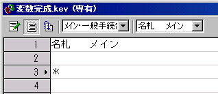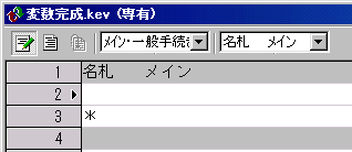| 方法は、 フォーム「変数途中.wfm」を、定義で開きます。このとき、ファイル名は確認してください。 フォームのオブジェクト属性から、イベントタブのイベントファイル名を「変数完成.kev」と変更してください この状態で、イベントファイルを開きます。 方法は、マウスの右クリックで「イベント定義」または、メニュから書式(S)→イベント定義(E)を、選択します >名札 メイン > >* これだけのイベントファイルが開きます。 ・最初に、「手続き編集」モードになってる場合は、「ファイル編集」モードに変更します。 方法は、画面左上の「手続き編集」モード(メモ帳)になってると思いますので、「ファイル編集」モードに変更します。下記図参照 (変更方法は、左から2番目のアイコンをクリックします) |
