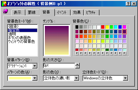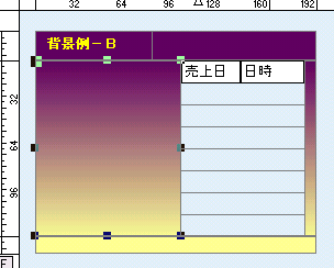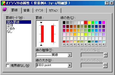◇ 今回のフォームは、一端に項目を配置し、他方にオブジェクトを配置した形ですこのスタイルで、気をつけなければいけないのは、行の反転が、他のオブジェクトの場所まで影響があります。そこで、私が普段使用しているのは左右の罫線の幅を調整し、対応していました。 図−11(表示例)・図−12(属性画面)実際利用する場合はの色は、背景と同色に設定します |