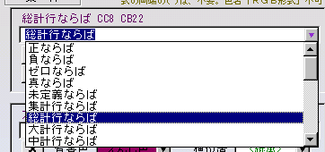 選択値リストの内容 正ならば,負ならば,ゼロならば,真ならば,未定義ならば,集計行ならば,総計行ならば,大計行ならば,中計行ならば,小計行ならば,小計1行ならば,小計2行ならば,小計3行ならば,小計4行ならば,小計5行ならば,小計6行ならば, " −−以下参考に−−","奇数行ならば #mod(#行番号,2)=1","偶数行ならば #mod(#行番号,2)=0","3行目ごとに #mod(#行番号,3)=0","5行目ごとに #mod(#行番号,5)=0","3行ごとにA #mod(#行番号-1,6)<3","3行ごとにB #mod(#行番号-1,6)=>3","5行ごとにA #mod(#行番号-1,10)<5","5行ごとにB #mod(#行番号-1,10)=>5","※を含む #文字位置([項目名]"+","+"""※"""+")>0","3文字目が※ #文字位置([項目名]"+","+"""※"""+")=3","計算式 #項目種別([])=""計算""" |